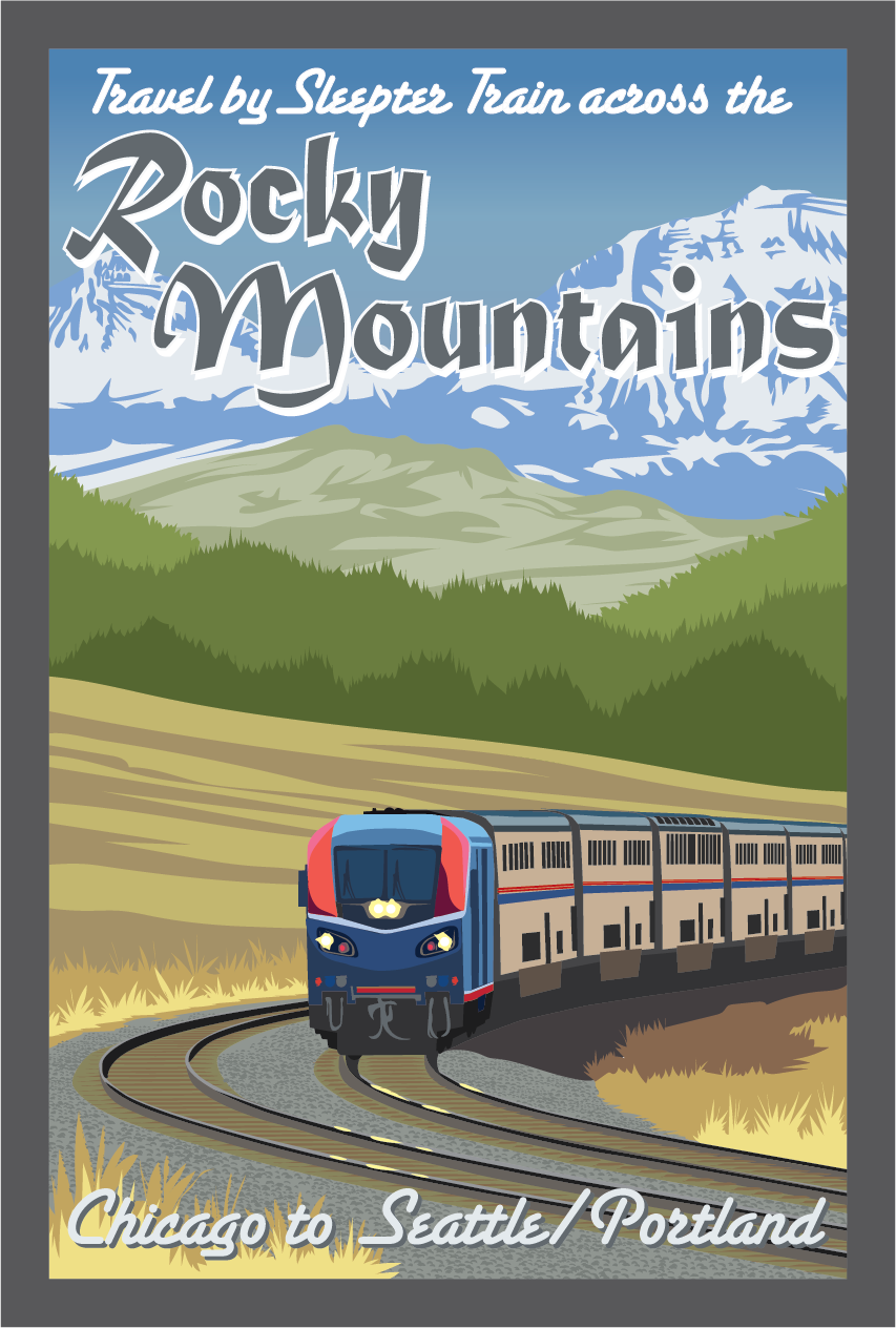 A vintage-themed image featuring Amtra[ck]’s Northernmost Cross Country Journey, Chicago to Portland and Seattle. The computer hand-drawn image can be printed on photo paper or canvas. Not AI generated!